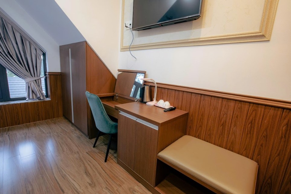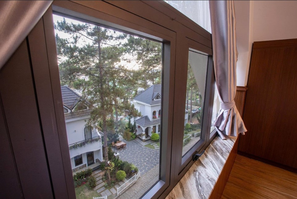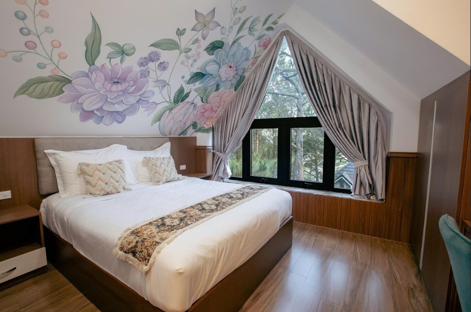 Không gian gọn gàng, ấm cúng, ánh sáng tràn nhẹ qua khung kính và view thông xanh mở ra ngay trước mắt - một căn phòng nhỏ, nhưng trọn vẹn không gian nghĩ dưỡng riêng tư và gần gũi với thiên nhiên.